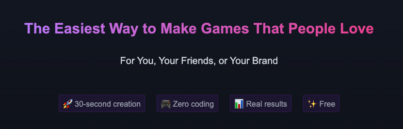 PlayCraft is an AI-powered game creation platform that enables anyone to build interactive, shareable games in 30 seconds without coding. Simply describe your idea in plain language, and our AI instantly generates a fully playable game that can be customized, published, and shared across any platform. PlayCraft transforms traditional marketing into interactive experiences. Create product launch games, lead generations, branded experiences that have achieved up to 106% sales increases and 91% engagement rates. Professional features include custom branding, lead capture forms. The platform includes customizable templates across categories like quizzes adventures, puzzles, and promotional games. Users can modify colors, assets, logic, and content to match their vision. Games can include images, , scoring systems, leaderboards, and prize mechanics. Whether you're a teacher creating study materials, a community manager driving engagement, a marketer generating leads, or someone planning a memorable proposal, PlayCraft democratizes game creation—making what once required developers and weeks of work possible in seconds, for free.